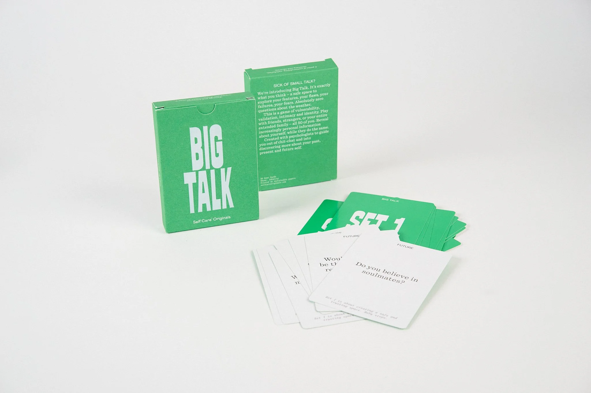 Designed by Studio HiHo, the Big Talk game cards are produced in a larger format playing cards packaged in a straight tuck box, 300gsm uncoated stock with a white foil debossed logo.