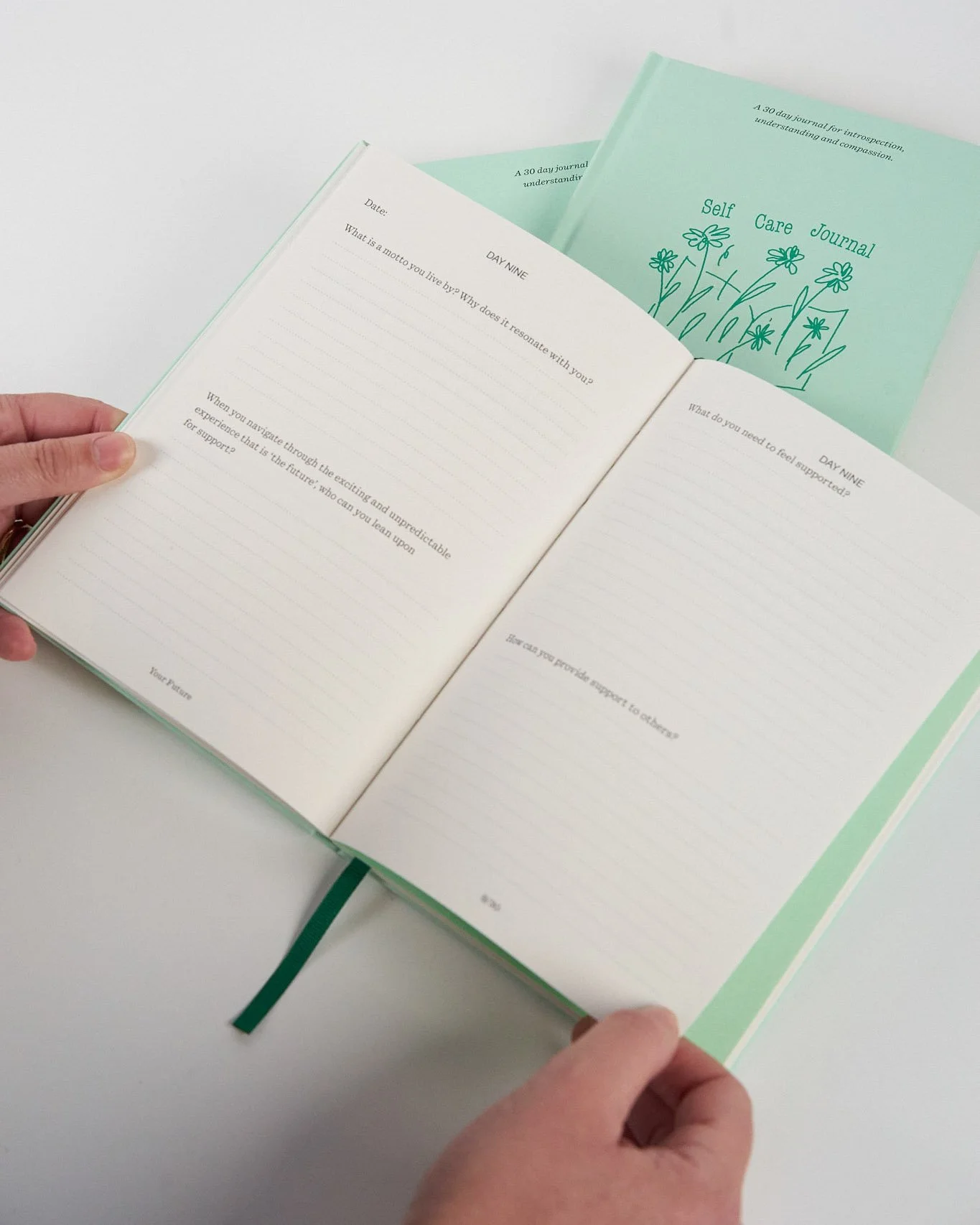 Designed by SODAA, the Self Care Journal features a Colorplan Park Green wrapped hardcover featuring an offset print and ribbon bookmark.